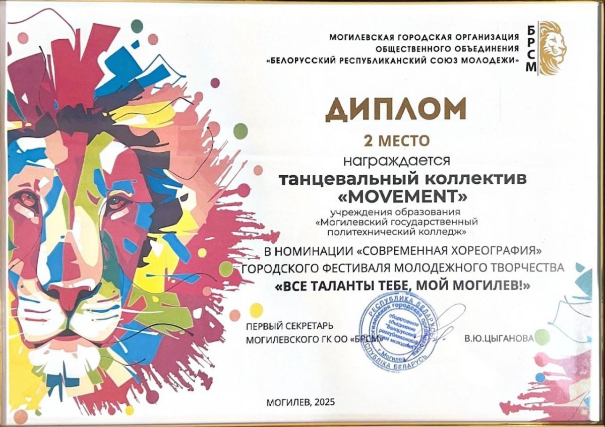 УО «Могилевский государственный политехнический колледж» награжден ДИПЛОМОМ 2 СТЕПЕНИ , в номинации «современная хореография».