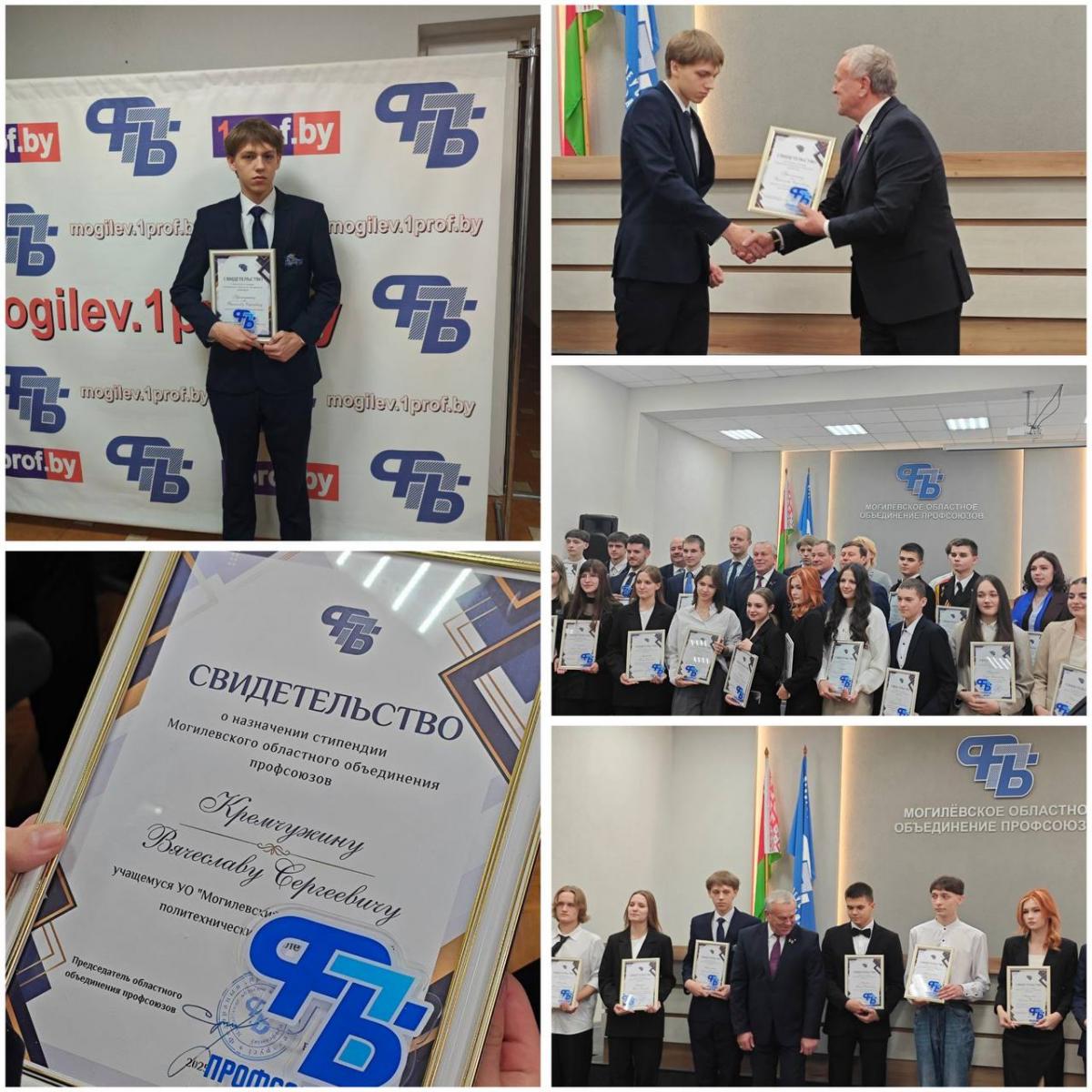 КРЕМЧУЖИНУ Вячеславу, учащемуся учебной группы ЭМС-483 в торжественной обстановке вручено свидетельство о назначении стипендии Федерации профсоюзов Беларуси председателем Могилевского областного объединения профсоюзов Владимиром Михайловичем Цумаревым.