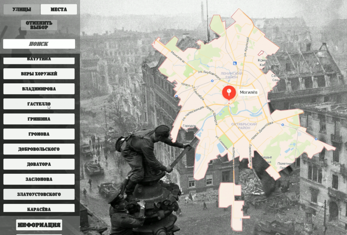 Приложение показывает на карте города Могилёва улицы и переулки, названные, в честь героев Великой Отечественной войны, а так же доносит до пользователей в простом и интересном интерфейсе информацию о них.