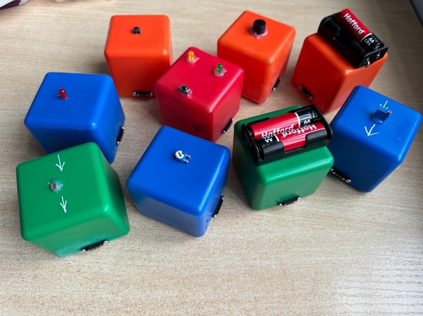 Представляет собой комплект пластиковых разноцветных кубиков с размещенными на верхней грани различными электронными компонентами. Элементы дополнительно зафиксированы термоклеем, соединительные провода припаяны и скрыты внутри кубиков во избежание механических повреждений и с целью повышения безопасности использования. Применен оригинальный способ соединения компонентов – не нужно паять и вдыхать вредный дым, достаточно просто составить цепь из кубиков. С целью обеспечить прочное соединение составных частей между собой использованы магнитные перемычки, закрепленные на гранях кубов. В наборе представлены следующие кубики-компоненты: кнопка; светодиод красный, светодиоды зеленый и желтый с переключателем, электродвигатель, фоторезистор, подстроечный резистор, зуммер, питание (2 шт от пальчиковых батареек типа АА). На отдельных кубиках стрелками указан способ подключения к прочим компонентам цепи с целью большей наглядности и отображения правил соединения. Между собой компоненты в цепь соединяются в произвольной форме попарно (минимально) либо увеличивая число элементов схемы.