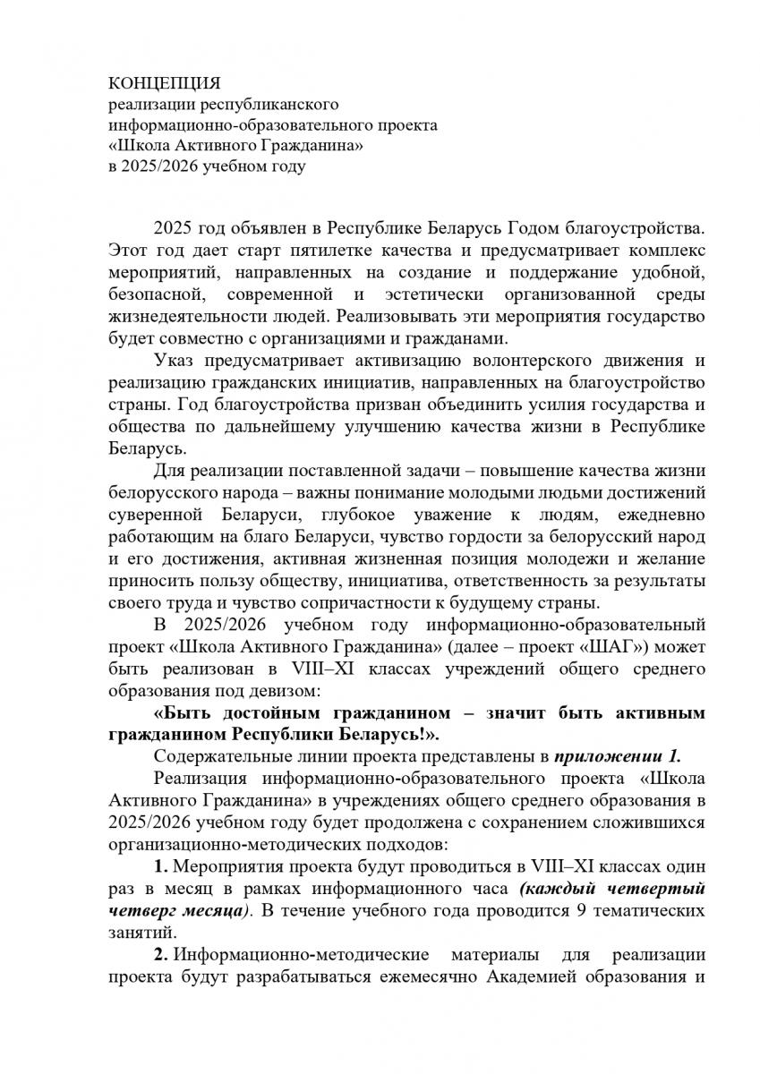 Ключевая идея информационно-образовательного проекта «ШАГ» – «Школа Активного Гражданина» в 2025/2026 учебном году – «Быть достойным гражданином – значит быть активным гражданином Республики Беларусь!».